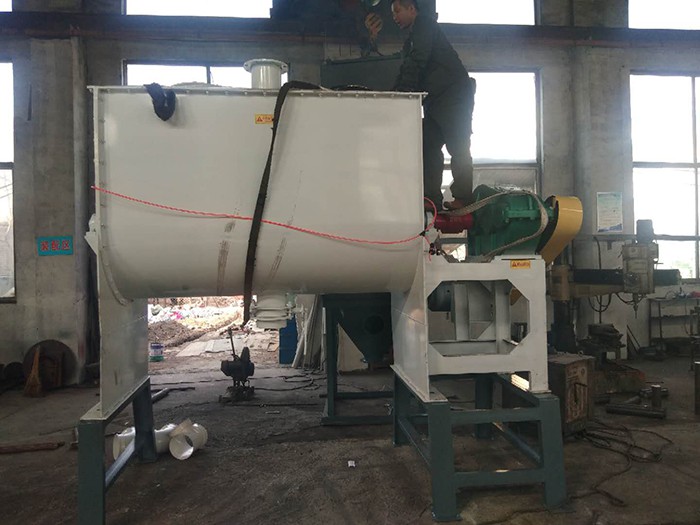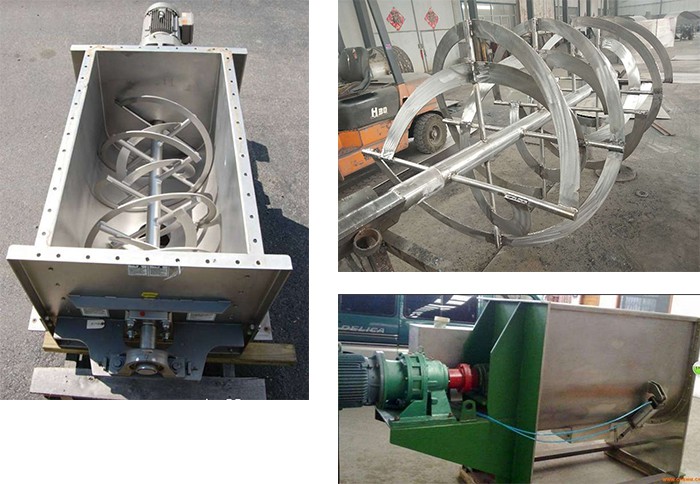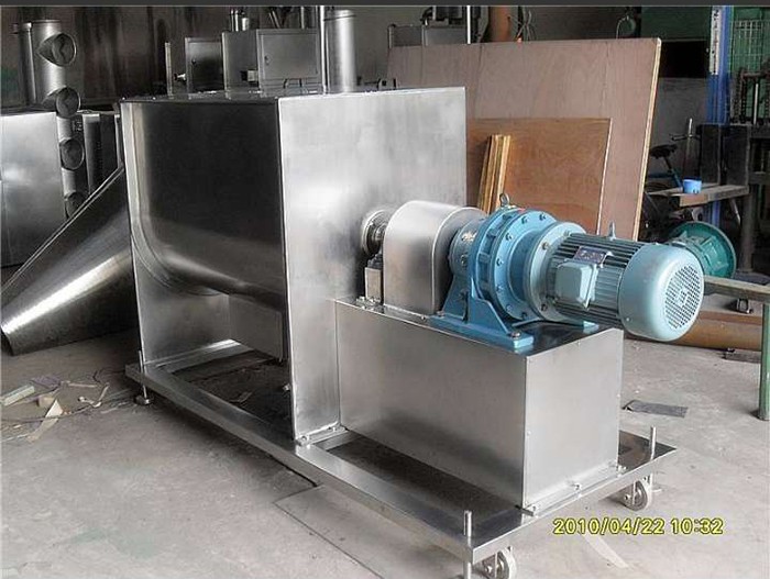 臥式混料機由U形容器、螺帶攪拌葉片和傳動部件組成;螺帶狀葉片一般做成雙層或三層,外層螺旋將物料從兩側向中間匯集,內層螺旋將物料從中間向兩側輸送,形成對流混合。 螺帶混合機對于粘性或有凝聚性的粉粒體的混合以及粉粒體中添加液體及糊狀物料的混合有良好的效果,筒蓋可做成全開式門,以便于對設備進行清洗更換產品。